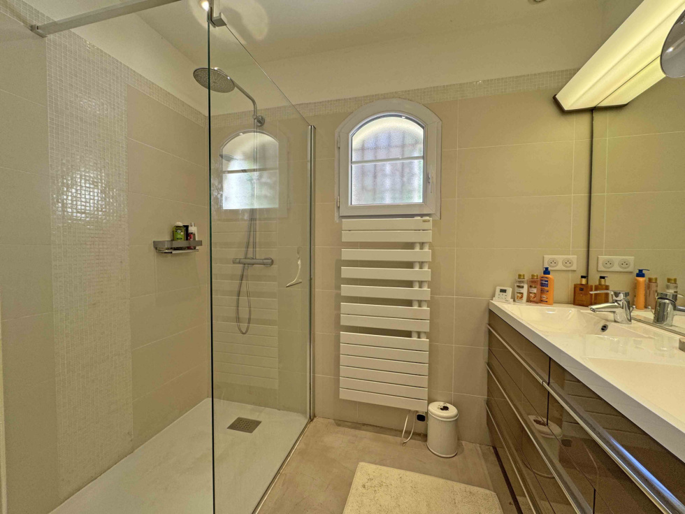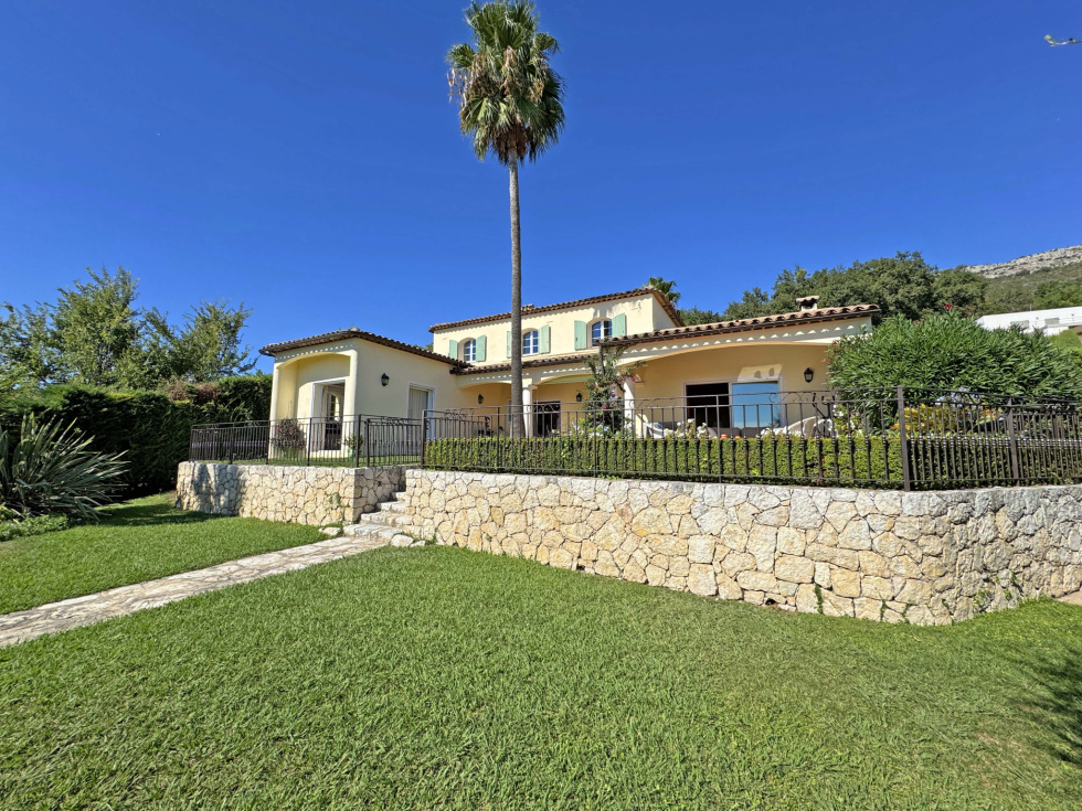 Située dans un domaine fermé, au calme et proche du centre de Vence, villa provençale de 180 m2 comprenant un séjour avec cheminée de 59 m2, cuisine équipée, bureau, chambre avec dressing et salle de douches, chambre avec salle de bains, 2 chambres, salle de douches, buanderie. Vue dégagée jusqu'à la mer. Terrain de 2.000 m2 avec piscine chauffée, terrain de pétanque, garage et abri voitures.