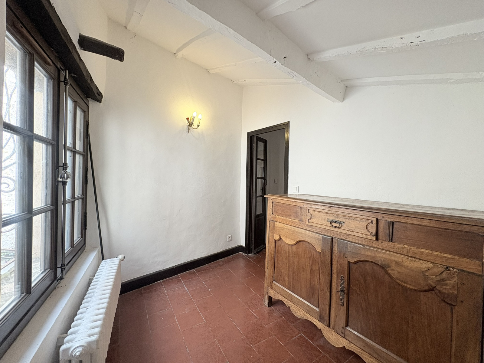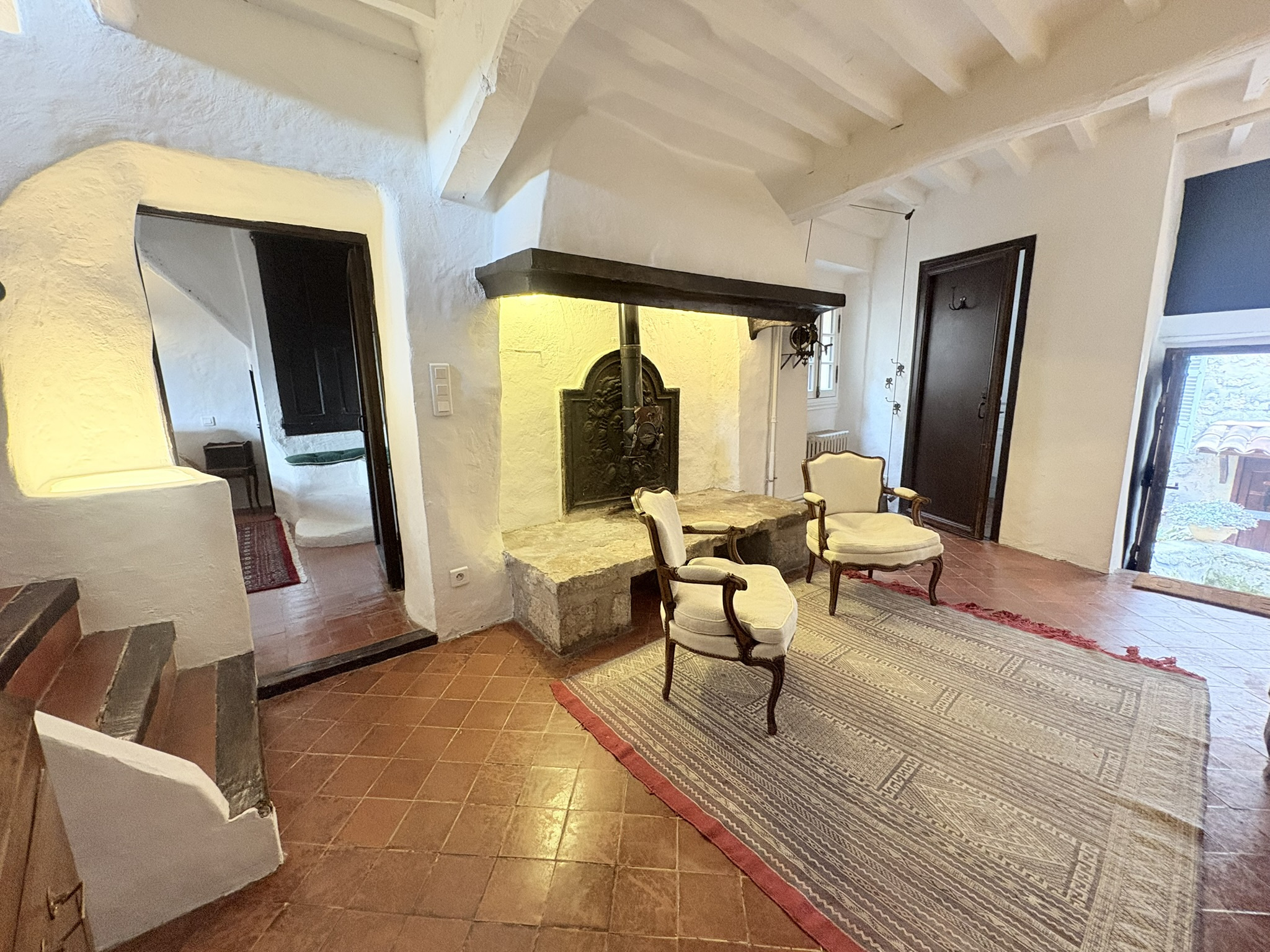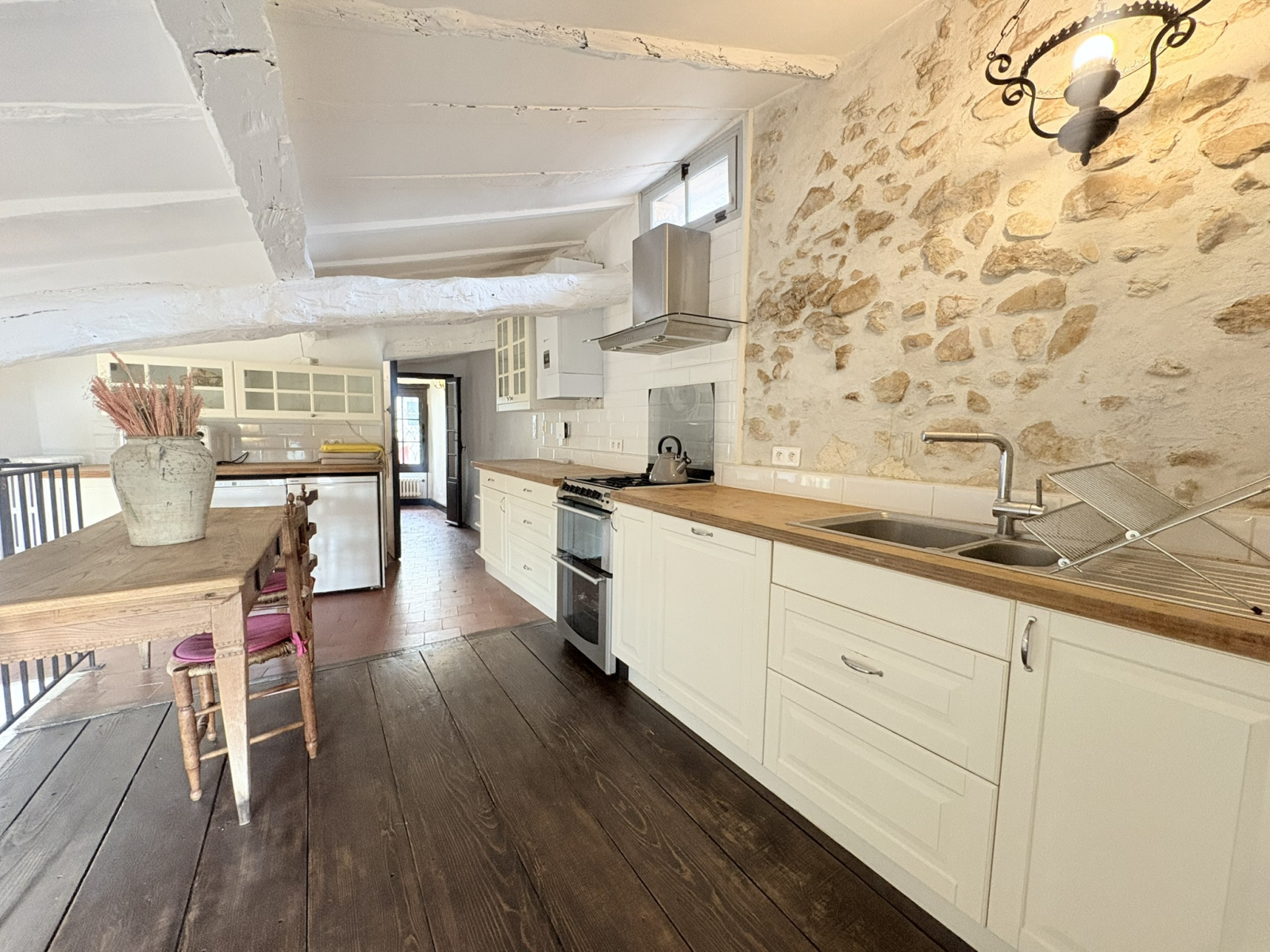 Le vaste salon – salle à manger, baigné de lumière grâce à ses cinq fenêtres, révèle une ambiance élégante et apaisante, sublimée par une cheminée ancienne. Vous trouverez également un bureau, parfait pour écrire, lire ou télétravailler dans un cadre inspirant, ainsi qu’une salle de bains avec WC.